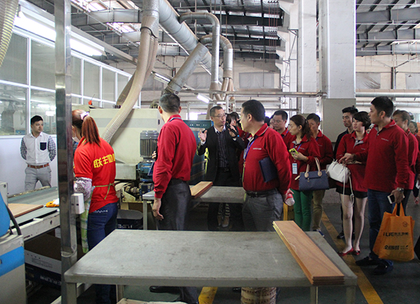 李總隨后引導(dǎo)大家參觀了實(shí)木和強(qiáng)化兩大工廠,作為2011年4月斥千萬巨資精心打造的一條生產(chǎn)線,其整合了當(dāng)下地板行業(yè)最新的生產(chǎn)工藝和管理模式,承載了聯(lián)豐全能王實(shí)木地板、熱佳能純實(shí)木抗地?zé)岬匕?、全屋除?/span>3600健康地板三大新“三架馬車”的生產(chǎn)制造,并從這里走向全國各地,可以說為聯(lián)豐產(chǎn)能實(shí)現(xiàn)歷史性跨越奠定了堅(jiān)實(shí)的基礎(chǔ)。強(qiáng)化工廠所擁有的最先進(jìn)的德國豪邁生產(chǎn)線,也是聯(lián)豐強(qiáng)化地板工藝技術(shù)同步國際、領(lǐng)先同內(nèi)的硬件保障。駐足在這里,所有的人都能感受到它的宏偉和震撼,同時(shí),大家也對如此精細(xì)的生產(chǎn)流程、優(yōu)質(zhì)的質(zhì)量管控感嘆不已。