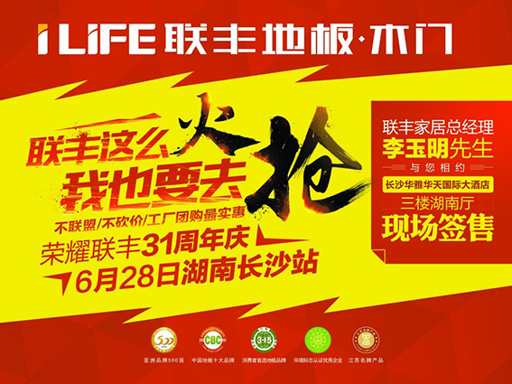 6月28日,主題為“聯豐這么火,我也要去搶”的湖南全省聯動工廠直供大會在長沙華雅華天國際酒店隆重舉行!為響應聯豐地板31周年慶,此次長沙站除了品類齊全的產品以外,最優惠的價格和最豐盛的禮品也成為這次活動中的一大亮點。人流涌動的活動現場不僅僅是聯豐品牌實力的展現,更是其彰顯核心競爭力最完美的呈現。