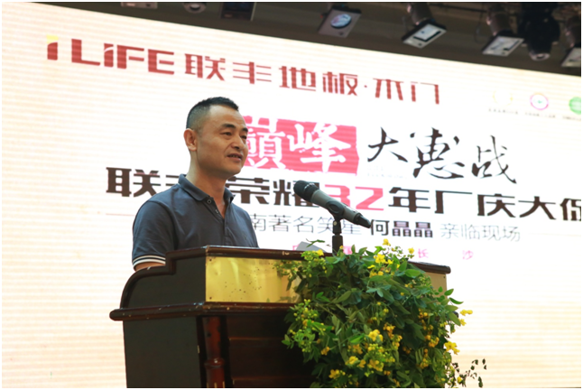 在一陣激情飛揚(yáng)、鼓掌整天的水鼓舞后,大惠戰(zhàn)正式拉開帷幕。聯(lián)豐木業(yè)董事長沈建新先生首先致歡迎致辭,鄭重承諾:一、本次活動(dòng)力度之大前所未有,全場均為工廠直供價(jià),全年保價(jià)。二、聯(lián)豐作為中國實(shí)木地板之父,亞洲品牌500強(qiáng),中國地板十大品牌,中國環(huán)保地板品牌等行業(yè)頂尖榮譽(yù)的獲得者,本次活動(dòng)銷售的所有產(chǎn)品均符合及優(yōu)于國家標(biāo)準(zhǔn)。三、本次“巔峰大惠戰(zhàn)—聯(lián)豐榮耀32年廠慶”大促僅限今天到現(xiàn)場的客戶予以享受工廠直供優(yōu)惠及超值服務(wù)。選擇聯(lián)豐就是選擇實(shí)惠,選擇聯(lián)豐就是選擇健康!希望位業(yè)主朋友滿意而來,滿載而歸,感謝大家32年來對(duì)聯(lián)豐的支持與信任,預(yù)祝“巔峰大惠戰(zhàn)—聯(lián)豐榮耀32年廠慶”大促圓滿舉行!董事長的承諾就是最大的強(qiáng)心劑,現(xiàn)場進(jìn)入白熱化搶購階段。