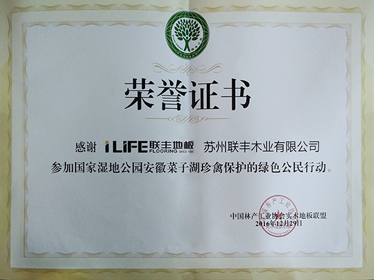 20161229日,中國林產工業協會實木地板聯盟與中國綠化基金會共同主辦的綠色公民行動走進安徽安慶菜子湖國家濕地公園——國家珍禽保護活動順利舉行,國家林業局、中國綠化基金會、中國林業產業聯合會、安徽省林業廳、安徽省濕地保護中心、安慶市等相關領導以及來自中國實木地板聯盟的企業代表共同出席本次活動。