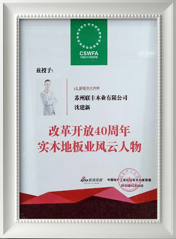 2018年,我國迎來了改革開放四十周年,這是家國巨變的40年,在這四十年中,地板行業(yè)從無到有,到強(qiáng),到精,獲得了全面的飛速發(fā)展,悄然形成了屬于地板人的黃金時(shí)代!12月29日,由中國林產(chǎn)工業(yè)協(xié)會(huì)實(shí)木地板聯(lián)盟舉辦的“改革開放四十周年實(shí)木地板業(yè)表彰大會(huì)”于浙江南潯隆重開幕,聯(lián)豐木業(yè)董事長沈建新先生應(yīng)邀出席大會(huì),并榮耀當(dāng)選“改革開放40年實(shí)木地板業(yè)風(fēng)云人物”!