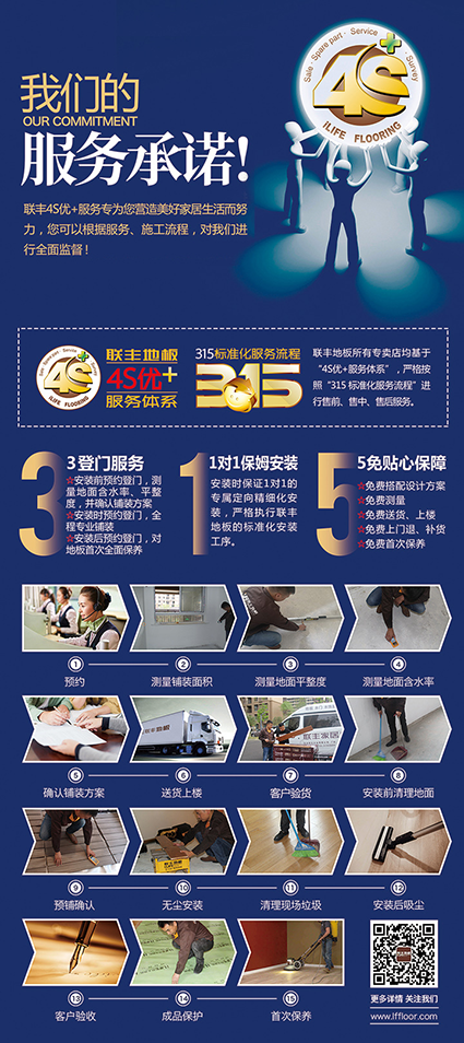 眾所周知,當今市場的競爭已然不是單純產品、花色和價格的競爭,而是服務等多元化的競爭,利用“服務營銷”打造門店核心競爭力,讓服務創造價值,是聯豐三十多年的持續追求。早在2010年,為拉升品牌高度,增強渠道生命力,提升消費者認同,聯豐就推出了專屬的4S優+服務體系,從地板銷售(Sale),到輔料配件(Spare part),售前售后服務(Service),再到信息反饋(Survey),每一個流程都做到規范化運作,并要求全國千家門店都要嚴格按照“315標準化服務流程”進行售前、售中、售后服務。
