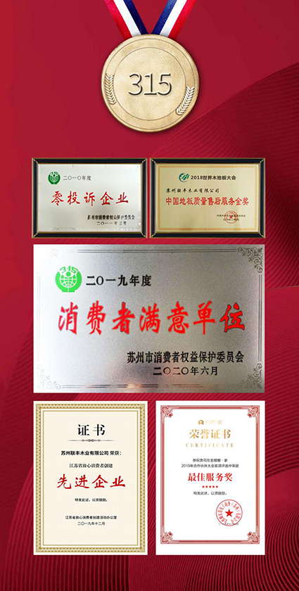2003年,聯豐榮獲質量和售后服務30家雙承諾企業。2005年,榮獲“中國木地板30家市場放心品牌”。2010年,全國367個地級以上城市調查,榮獲“經銷商首推實木地板品牌”以及蘇州市消費者權益保護委員會“零投訴企業”。2018年,世界木地板大會,榮獲“中國地板質量售后服務金獎”。2019年,榮獲江蘇省放心消費創建活動辦公室“先進企業”。2020年,榮獲蘇州市消費者權益保護委員會“消費者滿意單位”。聯豐服務規范化為聯豐品牌化插上騰飛翅膀的同時,也直接助力在市場上的強勢表現,作為國內家裝領域的頭部企業,聯豐在與金螳螂·家的戰略合作中,連續于2018年、2019年在其眾多的合作伙伴中脫穎而出,榮獲“最佳服務獎”。
