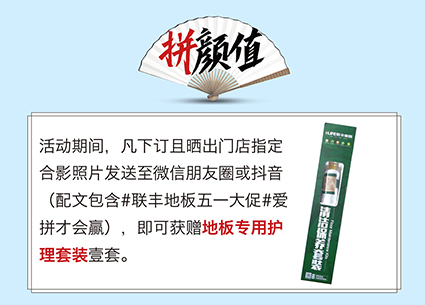 活動期間,凡下訂且曬出門店指定合影照片發送至微信朋友圈或抖音(配文包含#聯豐地板五一大促#愛拼才會贏),即可獲贈地板專用護理套裝壹套。