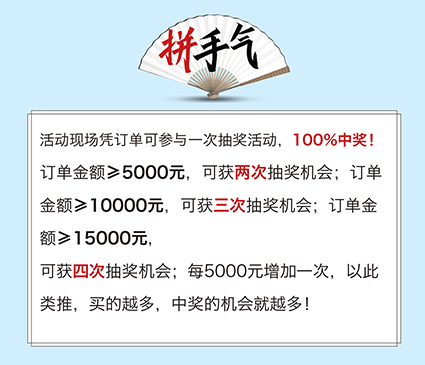 訂單金額≥5000元,可獲兩次抽獎機會;訂單金額≥10000元,可獲三次抽獎機會;訂單金額≥15000元,可獲四次抽獎機會;每5000元增加一次,以此類推,買的越多,中獎的機會就越多!