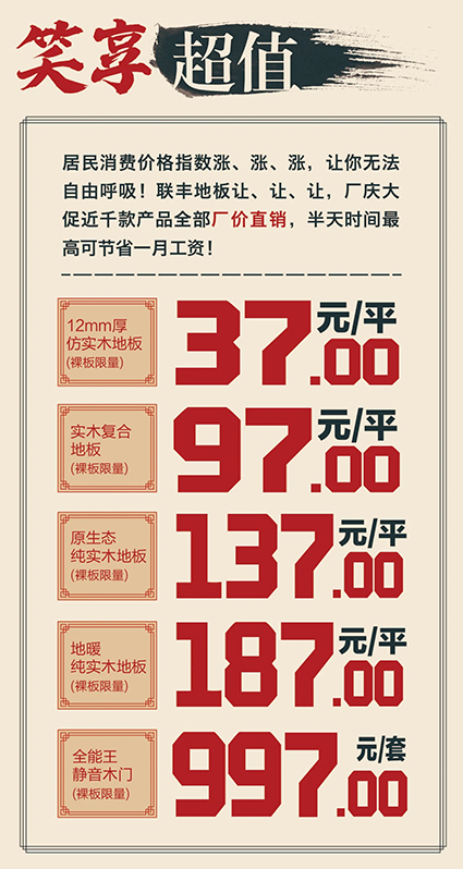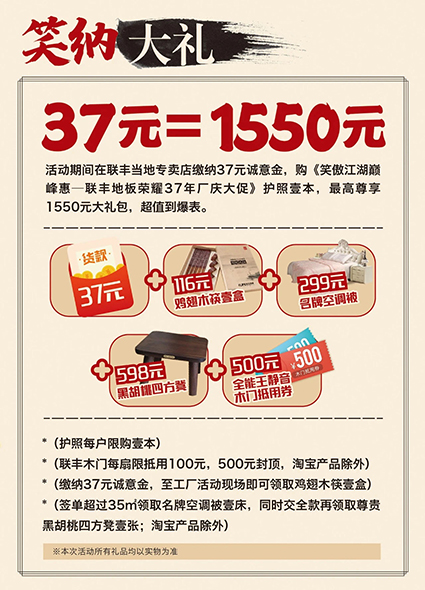 喜歡他,就趕快報(bào)名,親臨聯(lián)豐與偶像零距離,現(xiàn)場更為您的愛家準(zhǔn)備了數(shù)百款品優(yōu)價(jià)廉的地板和木門產(chǎn)品,砸金蛋、抽大獎等環(huán)節(jié)將誕生百萬豪禮,就等你來搶!