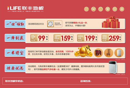 活動期間,凡購買聯豐健康優品(全屋除醛360°健康地板,醛凈康地板兩大系列指定型號),即可獲贈品牌空氣凈化器一臺,硬實力守護小家健康。