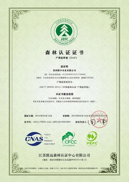 為踐行可持續(xù)發(fā)展的生態(tài)大計(jì),聯(lián)豐地板堅(jiān)持應(yīng)用合法木材,躬身保護(hù)森林資源,拿下地板類第一張“中國森林認(rèn)證CFCC-COC證書”。