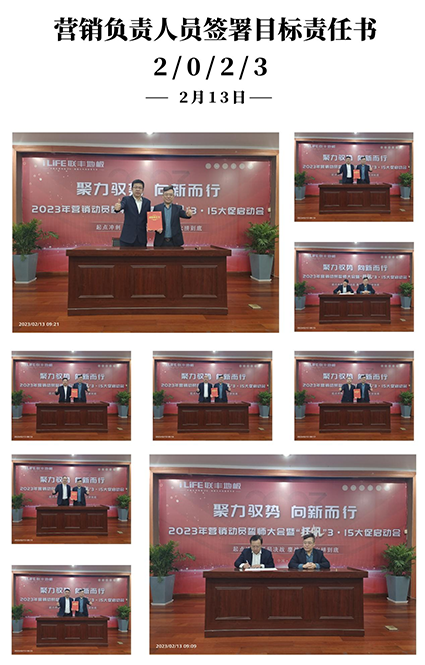 針對公司2023總體戰略布局,營銷中心各部門、大區負責人逐一上臺,簽訂年度營銷目標責任書,大家紛紛表示,新的一年將始終保持緊迫感、使命感、責任感,全力形成一盤棋,擰成一股繩,以積極肯干、務實奮斗的精神狀態誓達目標。