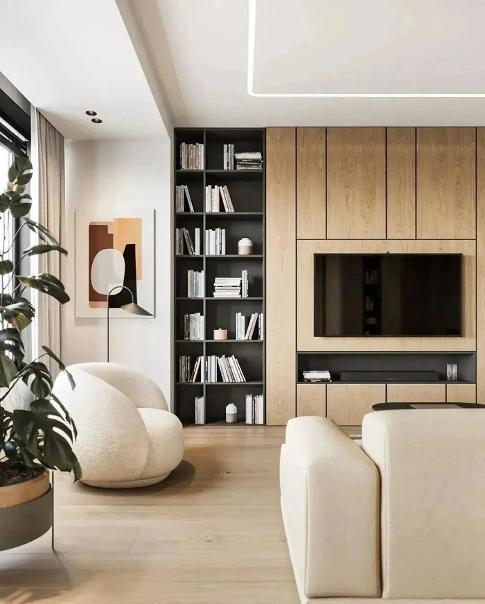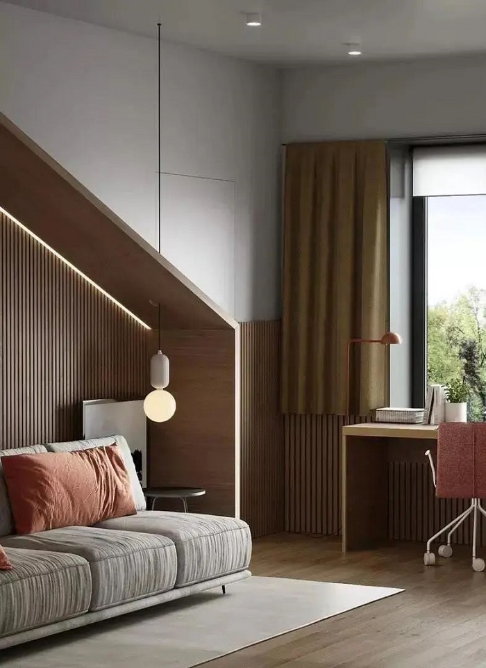簡(jiǎn)約灰白與原木色聯(lián)豐與之呼應(yīng)呈現(xiàn)出高級(jí)感,線條感貫穿在墻壁、書(shū)架之間的設(shè)計(jì),搭配著春日生機(jī)昂揚(yáng)的綠植,形成另一番愜意之感。