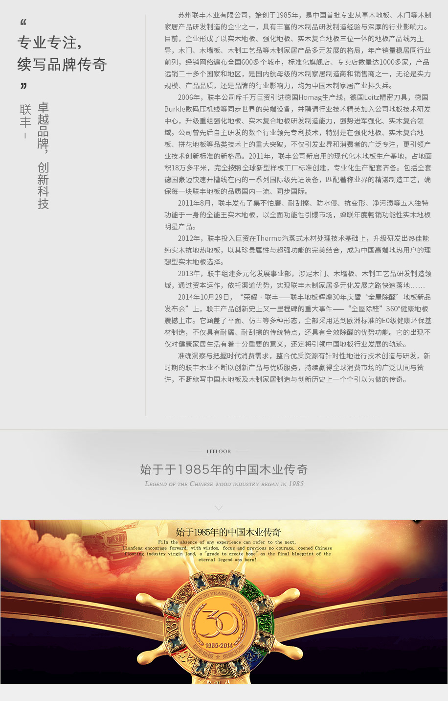 蘇州聯豐木業有限公司,始創于1985年,是中國最早專業從事木地板、木門等木制家居產品研發制造的企業之一,具有豐富的木制品研發制造經驗與深厚的行業影響力。目前,企業形成了以實木地板、強化地板、實木復合地板三位一體的地板產品線為主導,木門、木墻板、木制工藝品等木制家居產品多元發展的格局,年產銷量穩居同行業前列,經銷網絡遍布全國600多個城市,標準化旗艦店、專賣店數量達1000多家,產品遠銷二十多個國家和地區,是國內最大的木制家居制造商和銷售商之一,無論是實力規模、產品品質,還是品牌的行業影響力,均處于中國木制家居產業領軍地位。